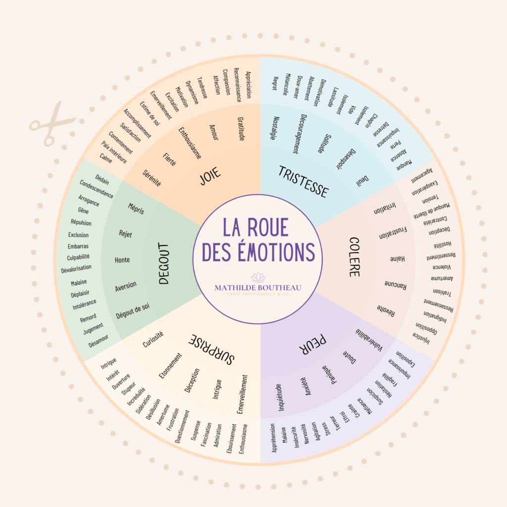 Pour t’aider à identifier et nommer ce que tu ressens, j’ai créé une roue des émotions que tu peux télécharger gratuitement juste ici: